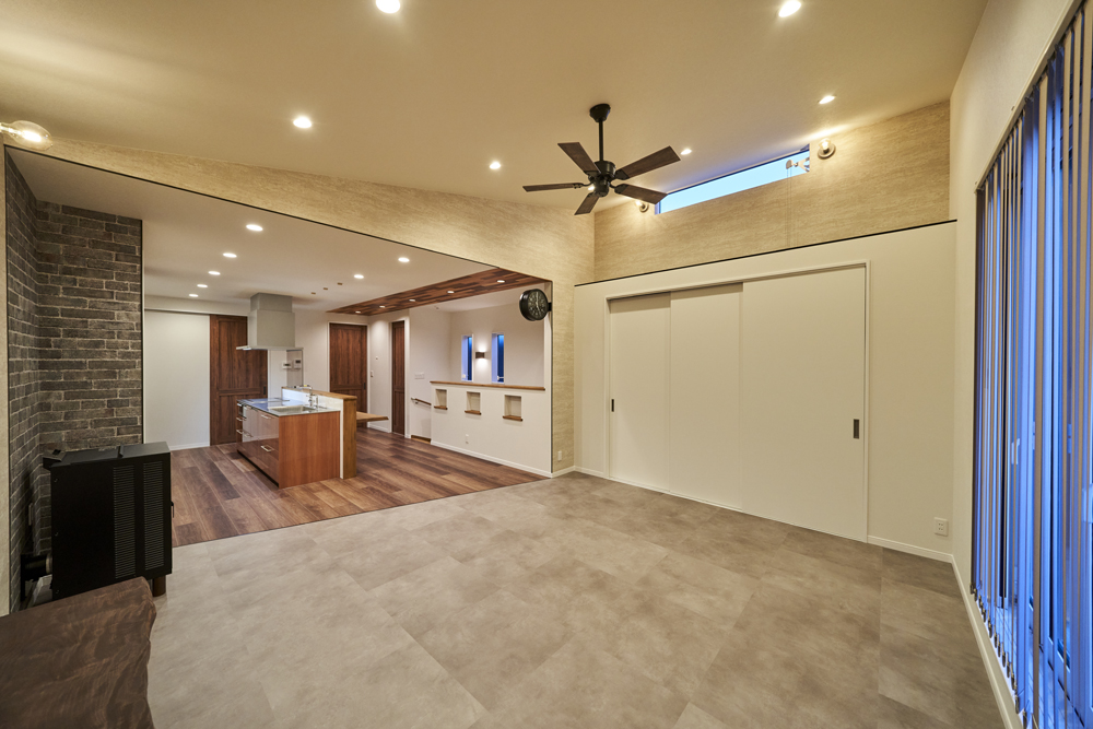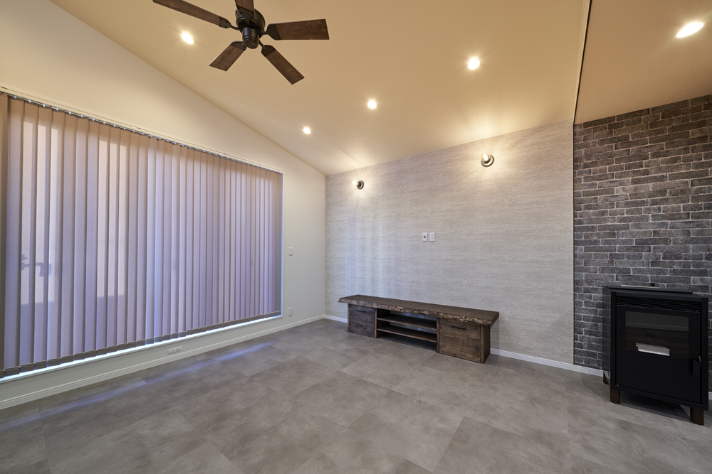 土地幅が狭く、南北に長い家。2FのLDKにコンセプトを絞り、ペレットストーブの勾配天井が見どころです。
